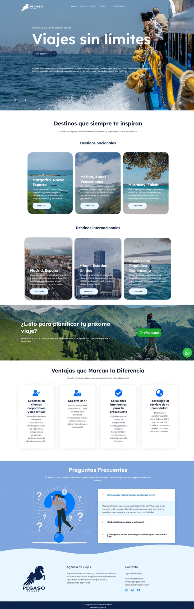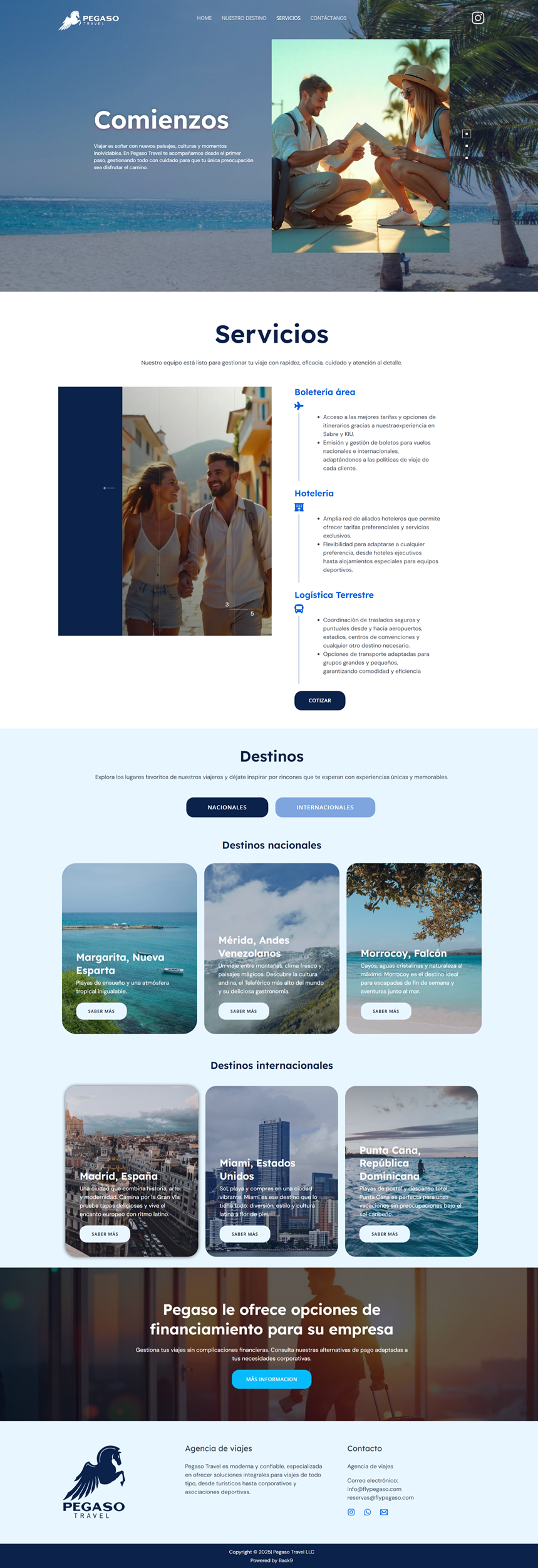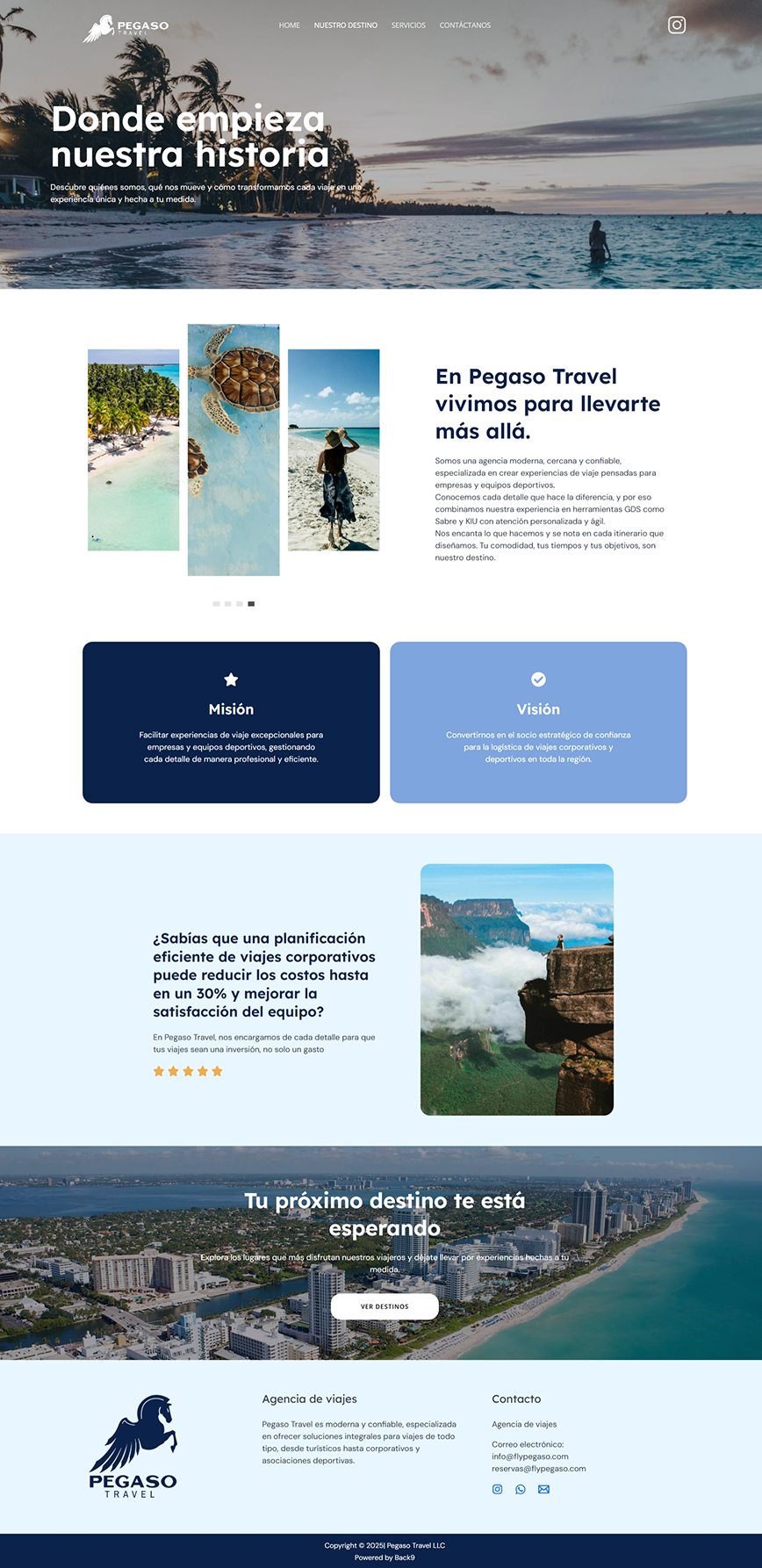 Back9 developed the official website of Pegaso Travel, a modern travel agency specialized in offering personalized services for all types of travelers, while also providing comprehensive solutions for businesses and institutions. The website delivers a seamless user experience to simplify and manage every travel need with agility and reliability.
